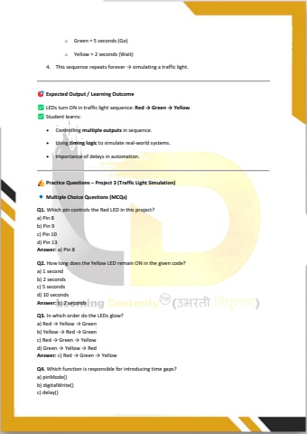 o Green = 5 seconds (Go)o Yellow = 2 seconds (Wait)4. This sequence repeats forever %u2192 simulating a traffic light. Expected Output / Learning Outcome LEDs turn ON in traffic light sequence: Red %u2192 Green %u2192 Yellow. Student learns:%u2022 Controlling multiple outputs in sequence.%u2022 Using timing logic to simulate real-world systems.%u2022 Importance of delays in automation. Practice Questions %u2013 Project 3 (Traffic Light Simulation) Multiple Choice Questions (MCQs)Q1. Which pin controls the Red LED in this project?a) Pin 8b) Pin 9c) Pin 10d) Pin 13Answer: a) Pin 8Q2. How long does the Yellow LED remain ON in the given code?a) 1 secondb) 2 secondsc) 5 secondsd) 10 secondsAnswer: b) 2 secondsQ3. In which order do the LEDs glow?a) Red %u2192 Yellow %u2192 Greenb) Yellow %u2192 Red %u2192 Greenc) Red %u2192 Green %u2192 Yellowd) Green %u2192 Yellow %u2192 RedAnswer: c) Red %u2192 Green %u2192 YellowQ4. Which function is responsible for introducing time gaps?a) pinMode()b) digitalWrite()c) delay()