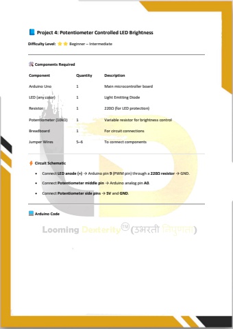 Project 4: Potentiometer Controlled LED BrightnessDifficulty Level: Beginner %u2013 Intermediate Components RequiredComponent Quantity DescriptionArduino Uno 1 Main microcontroller boardLED (any color) 1 Light Emitting DiodeResistor 1 220%u03a9 (for LED protection)Potentiometer (10k%u03a9) 1 Variable resistor for brightness controlBreadboard 1 For circuit connectionsJumper Wires 5%u20136 To connect components Circuit Schematic%u2022 Connect LED anode (+) %u2192 Arduino pin 9 (PWM pin) through a 220%u03a9 resistor %u2192 GND.%u2022 Connect Potentiometer middle pin %u2192 Arduino analog pin A0.%u2022 Connect Potentiometer side pins %u2192 5V and GND. Arduino Code