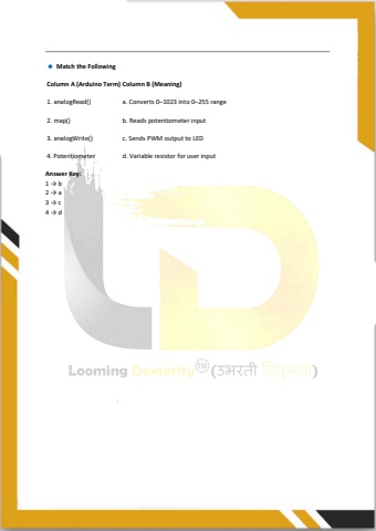 Match the FollowingColumn A (Arduino Term) Column B (Meaning)1. analogRead() a. Converts 0%u20131023 into 0%u2013255 range2. map() b. Reads potentiometer input3. analogWrite() c. Sends PWM output to LED4. Potentiometer d. Variable resistor for user inputAnswer Key:1 %u2192 b2 %u2192 a3 %u2192 c4 %u2192 d