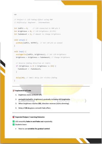 Explanation of Code1. brightness starts at 0 (LED off).2. analogWrite(ledPin, brightness); gradually increases LED brightness.3. When brightness reaches 255, direction reverses (starts dimming).4. Delay of 30 ms gives a smooth fade effect. Expected Output / Learning Outcome LED smoothly fades in and fades out repeatedly. Students learn:%u2022 How to use variables for gradual control.