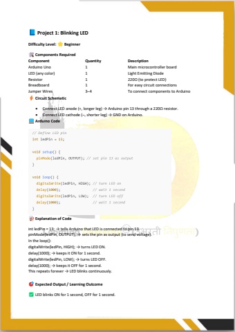 Project 1: Blinking LEDDifficulty Level: Beginner Components RequiredComponent Quantity DescriptionArduino Uno 1 Main microcontroller boardLED (any color) 1 Light Emitting DiodeResistor 1 220%u03a9 (to protect LED)Breadboard 1 For easy circuit connectionsJumper Wires 3%u20134 To connect components to Arduino Circuit Schematic%u2022 Connect LED anode (+, longer leg) %u2192 Arduino pin 13 through a 220%u03a9 resistor.%u2022 Connect LED cathode (%u2013, shorter leg) %u2192 GND on Arduino. Arduino Code Explanation of Codeint ledPin = 13; %u2192 tells Arduino that LED is connected to pin 13.pinMode(ledPin, OUTPUT); %u2192 sets the pin as output (to send voltage).In the loop():digitalWrite(ledPin, HIGH); %u2192 turns LED ON.delay(1000); %u2192 keeps it ON for 1 second.digitalWrite(ledPin, LOW); %u2192 turns LED OFF.delay(1000); %u2192 keeps it OFF for 1 second.This repeats forever %u2192 LED blinks continuously. Expected Output / Learning Outcome LED blinks ON for 1 second, OFF for 1 second.