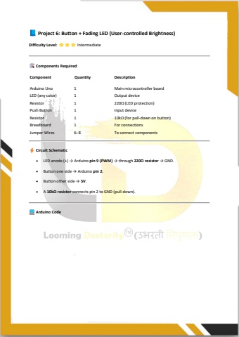Project 6: Button + Fading LED (User-controlled Brightness)Difficulty Level: Intermediate Components RequiredComponent Quantity DescriptionArduino Uno 1 Main microcontroller boardLED (any color) 1 Output deviceResistor 1 220%u03a9 (LED protection)Push Button 1 Input deviceResistor 1 10k%u03a9 (for pull-down on button)Breadboard 1 For connectionsJumper Wires 6%u20138 To connect components Circuit Schematic%u2022 LED anode (+) %u2192 Arduino pin 9 (PWM) %u2192 through 220%u03a9 resistor %u2192 GND.%u2022 Button one side %u2192 Arduino pin 2.%u2022 Button other side %u2192 5V.%u2022 A 10k%u03a9 resistor connects pin 2 to GND (pull-down). Arduino Code
