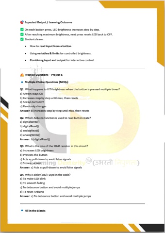 Expected Output / Learning Outcome On each button press, LED brightness increases step by step. After reaching maximum brightness, next press resets LED back to OFF. Students learn:%u2022 How to read input from a button.%u2022 Using variables & limits for controlled brightness.%u2022 Combining input and output for interactive control. Practice Questions %u2013 Project 6 Multiple Choice Questions (MCQs)Q1. What happens to LED brightness when the button is pressed multiple times?a) Always stays ONb) Increases step by step until max, then resetsc) Always turns OFFd) Randomly changesAnswer: b) Increases step by step until max, then resetsQ2. Which Arduino function is used to read button state?a) digitalWrite()b) digitalRead()c) analogRead()d) analogWrite()Answer: b) digitalRead()Q3. What is the role of the 10k%u03a9 resistor in this circuit?a) Increases LED brightnessb) Protects the buttonc) Acts as pull-down to avoid false signalsd) Stores currentAnswer: c) Acts as pull-down to avoid false signalsQ4. Why is delay(200); used in the code?a) To make LED blinkb) To smooth fadingc) To debounce button and avoid multiple jumpsd) To reset ArduinoAnswer: c) To debounce button and avoid multiple jumps Fill in the Blanks