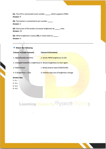 Q1. The LED is connected to pin number _____, which supports PWM.Answer: 9Q2. The button is connected to pin number _____.Answer: 2Q3. Each press of the button increases brightness by _____ units.Answer: 25Q4. When brightness crosses 255, it resets back to _____.Answer: 0 Match the FollowingColumn A (Code Element) Column B (Function)1. digitalRead(buttonPin) a. Sends PWM brightness to LED2. analogWrite(ledPin, brightness) b. Resets brightness to start again3. fadeAmount c. Reads button state (HIGH/LOW)4. if (brightness > 255) d. Defines step size of brightness changeAnswer Key:1 %u2192 c2 %u2192 a3 %u2192 d4 %u2192 b