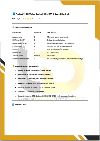 Project 7: DC Motor Control (ON/OFF & Speed Control)Difficulty Level: Intermediate Components RequiredComponent Quantity DescriptionArduino Uno 1 Main microcontroller boardDC Motor (5%u20139V) 1 Output device (rotation)L293D Motor Driver 1 To safely drive motor from ArduinoPush Button 1 Input device (for ON/OFF control)Resistor 1 10k%u03a9 (pull-down for button)Breadboard 1 For connectionsJumper Wires Several For wiringExternal Power Supply 1 6V%u20139V battery (for motor, not Arduino directly) Circuit Schematic (Conceptual)%u2022 Motor %u2192 L293D output pins (OUT1, OUT2).%u2022 L293D IN1 %u2192 Arduino pin 9 (PWM capable).%u2022 L293D EN1 %u2192 Arduino pin 5 (to enable motor).%u2022 Button %u2192 Arduino pin 2 (with 10k%u03a9 pull-down).%u2022 External battery %u2192 powers motor via L293D Vcc2.%u2022 Arduino 5V %u2192 powers L293D Vcc1.%u2022 Grounds (Arduino GND, battery GND, L293D GND) %u2192 all connected together. Arduino Code
