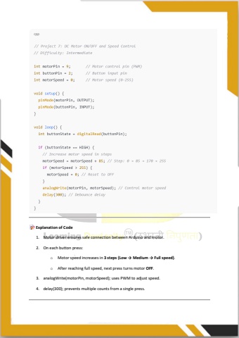 Explanation of Code1. Motor driver ensures safe connection between Arduino and motor.2. On each button press:o Motor speed increases in 3 steps (Low %u2192 Medium %u2192 Full speed).o After reaching full speed, next press turns motor OFF.3. analogWrite(motorPin, motorSpeed); uses PWM to adjust speed.4. delay(300); prevents multiple counts from a single press.