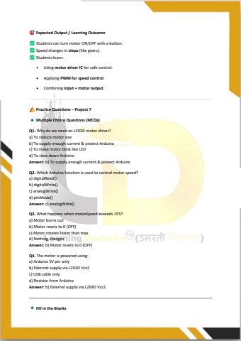 Expected Output / Learning Outcome Students can turn motor ON/OFF with a button. Speed changes in steps (like gears). Students learn:%u2022 Using motor driver IC for safe control.%u2022 Applying PWM for speed control.%u2022 Combining input + motor output. Practice Questions %u2013 Project 7 Multiple Choice Questions (MCQs)Q1. Why do we need an L293D motor driver?a) To reduce motor sizeb) To supply enough current & protect Arduinoc) To make motor blink like LEDd) To slow down ArduinoAnswer: b) To supply enough current & protect ArduinoQ2. Which Arduino function is used to control motor speed?a) digitalRead()b) digitalWrite()c) analogWrite()d) pinMode()Answer: c) analogWrite()Q3. What happens when motorSpeed exceeds 255?a) Motor burns outb) Motor resets to 0 (OFF)c) Motor rotates faster than maxd) Nothing changesAnswer: b) Motor resets to 0 (OFF)Q4. The motor is powered using:a) Arduino 5V pin onlyb) External supply via L293D Vcc2c) USB cable onlyd) Resistor from ArduinoAnswer: b) External supply via L293D Vcc2 Fill in the Blanks