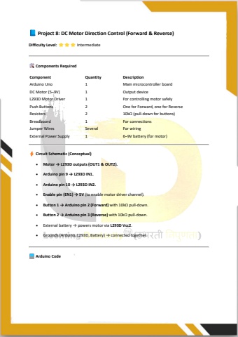 Project 8: DC Motor Direction Control (Forward & Reverse)Difficulty Level: Intermediate Components RequiredComponent Quantity DescriptionArduino Uno 1 Main microcontroller boardDC Motor (5%u20139V) 1 Output deviceL293D Motor Driver 1 For controlling motor safelyPush Buttons 2 One for Forward, one for ReverseResistors 2 10k%u03a9 (pull-down for buttons)Breadboard 1 For connectionsJumper Wires Several For wiringExternal Power Supply 1 6%u20139V battery (for motor) Circuit Schematic (Conceptual)%u2022 Motor %u2192 L293D outputs (OUT1 & OUT2).%u2022 Arduino pin 9 %u2192 L293D IN1.%u2022 Arduino pin 10 %u2192 L293D IN2.%u2022 Enable pin (EN1) %u2192 5V (to enable motor driver channel).%u2022 Button 1 %u2192 Arduino pin 2 (Forward) with 10k%u03a9 pull-down.%u2022 Button 2 %u2192 Arduino pin 3 (Reverse) with 10k%u03a9 pull-down.%u2022 External battery %u2192 powers motor via L293D Vcc2.%u2022 Grounds (Arduino, L293D, Battery) %u2192 connected together. Arduino Code