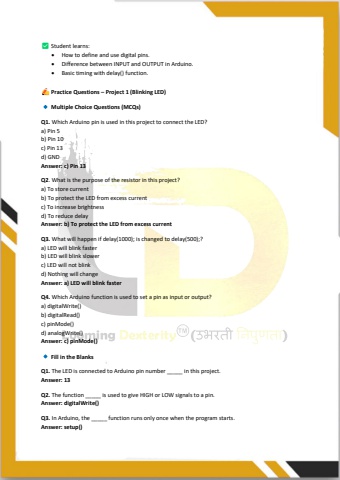 Student learns:%u2022 How to define and use digital pins.%u2022 Difference between INPUT and OUTPUT in Arduino.%u2022 Basic timing with delay() function. Practice Questions %u2013 Project 1 (Blinking LED) Multiple Choice Questions (MCQs)Q1. Which Arduino pin is used in this project to connect the LED?a) Pin 5b) Pin 10c) Pin 13d) GNDAnswer: c) Pin 13Q2. What is the purpose of the resistor in this project?a) To store currentb) To protect the LED from excess currentc) To increase brightnessd) To reduce delayAnswer: b) To protect the LED from excess currentQ3. What will happen if delay(1000); is changed to delay(500);?a) LED will blink fasterb) LED will blink slowerc) LED will not blinkd) Nothing will changeAnswer: a) LED will blink fasterQ4. Which Arduino function is used to set a pin as input or output?a) digitalWrite()b) digitalRead()c) pinMode()d) analogWrite()Answer: c) pinMode() Fill in the BlanksQ1. The LED is connected to Arduino pin number _____ in this project.Answer: 13Q2. The function _____ is used to give HIGH or LOW signals to a pin.Answer: digitalWrite()Q3. In Arduino, the _____ function runs only once when the program starts.Answer: setup()
