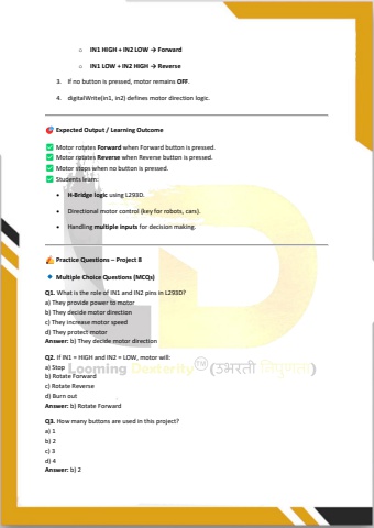 o IN1 HIGH + IN2 LOW %u2192 Forwardo IN1 LOW + IN2 HIGH %u2192 Reverse3. If no button is pressed, motor remains OFF.4. digitalWrite(in1, in2) defines motor direction logic. Expected Output / Learning Outcome Motor rotates Forward when Forward button is pressed. Motor rotates Reverse when Reverse button is pressed. Motor stops when no button is pressed. Students learn:%u2022 H-Bridge logic using L293D.%u2022 Directional motor control (key for robots, cars).%u2022 Handling multiple inputs for decision making. Practice Questions %u2013 Project 8 Multiple Choice Questions (MCQs)Q1. What is the role of IN1 and IN2 pins in L293D?a) They provide power to motorb) They decide motor directionc) They increase motor speedd) They protect motorAnswer: b) They decide motor directionQ2. If IN1 = HIGH and IN2 = LOW, motor will:a) Stopb) Rotate Forwardc) Rotate Reversed) Burn outAnswer: b) Rotate ForwardQ3. How many buttons are used in this project?a) 1b) 2c) 3d) 4Answer: b) 2
