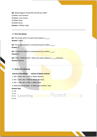 Q4. What happens if both IN1 and IN2 are LOW?a) Motor runs forwardb) Motor runs reversec) Motor stopsd) Motor burnsAnswer: c) Motor stops Fill in the BlanksQ1. The motor driver IC used in this project is _____.Answer: L293DQ2. The Forward button is connected to pin number _____.Answer: 2Q3. The Reverse button is connected to pin number _____.Answer: 3Q4. If IN1 = LOW and IN2 = HIGH, the motor rotates in _____ direction.Answer: Reverse Match the FollowingColumn A (Condition) Column B (Motor Action)1. IN1 = HIGH, IN2 = LOW a. Motor Reverse2. IN1 = LOW, IN2 = HIGH b. Motor Forward3. IN1 = LOW, IN2 = LOW c. Motor Stop4. Both buttons pressed d. May cause conflict / stopAnswer Key:1 %u2192 b2 %u2192 a3 %u2192 c4 %u2192 d
