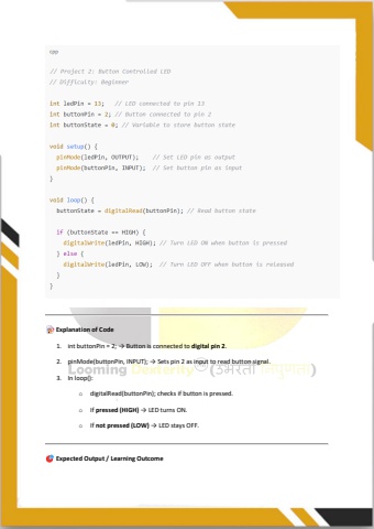 Explanation of Code1. int buttonPin = 2; %u2192 Button is connected to digital pin 2.2. pinMode(buttonPin, INPUT); %u2192 Sets pin 2 as input to read button signal.3. In loop():o digitalRead(buttonPin); checks if button is pressed.o If pressed (HIGH) %u2192 LED turns ON.o If not pressed (LOW) %u2192 LED stays OFF. Expected Output / Learning Outcome