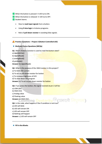 When the button is pressed %u2192 LED turns ON. When the button is released %u2192 LED turns OFF. Student learns:%u2022 How to read input signals from a button.%u2022 Using if-else logic in Arduino programs.%u2022 Role of pull-down resistor in avoiding false signals. Practice Questions %u2013 Project 2 (Button Controlled LED) Multiple Choice Questions (MCQs)Q1. Which Arduino function is used to read the button state?a) digitalWrite()b) digitalRead()c) analogRead()d) pinMode()Answer: b) digitalRead()Q2. What is the purpose of the 10k%u03a9 resistor in this project?a) To limit LED currentb) To act as pull-down resistor for buttonc) To increase brightness of LEDd) To slow down the programAnswer: b) To act as pull-down resistor for buttonQ3. If you press the button, the signal received at pin 2 will be:a) LOW (0V)b) HIGH (5V)c) Analog valued) Floating valueAnswer: b) HIGH (5V)Q4. In the code, what happens if the if condition is not true?a) LED will blinkb) LED will remain ONc) LED will remain OFFd) Nothing will happenAnswer: c) LED will remain OFF Fill in the Blanks