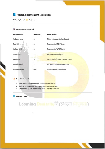 Project 3: Traffic Light SimulationDifficulty Level: Beginner Components RequiredComponent Quantity DescriptionArduino Uno 1 Main microcontroller boardRed LED 1 Represents STOP lightYellow LED 1 Represents WAIT lightGreen LED 1 Represents GO lightResistors 3 220%u03a9 each (for LED protection)Breadboard 1 For easy circuit connectionsJumper Wires 6%u20138 To connect components Circuit Schematic%u2022 Red LED %u2192 Pin 8 through 220%u03a9 resistor %u2192 GND.%u2022 Yellow LED %u2192 Pin 9 through 220%u03a9 resistor %u2192 GND.%u2022 Green LED %u2192 Pin 10 through 220%u03a9 resistor %u2192 GND. Arduino Code